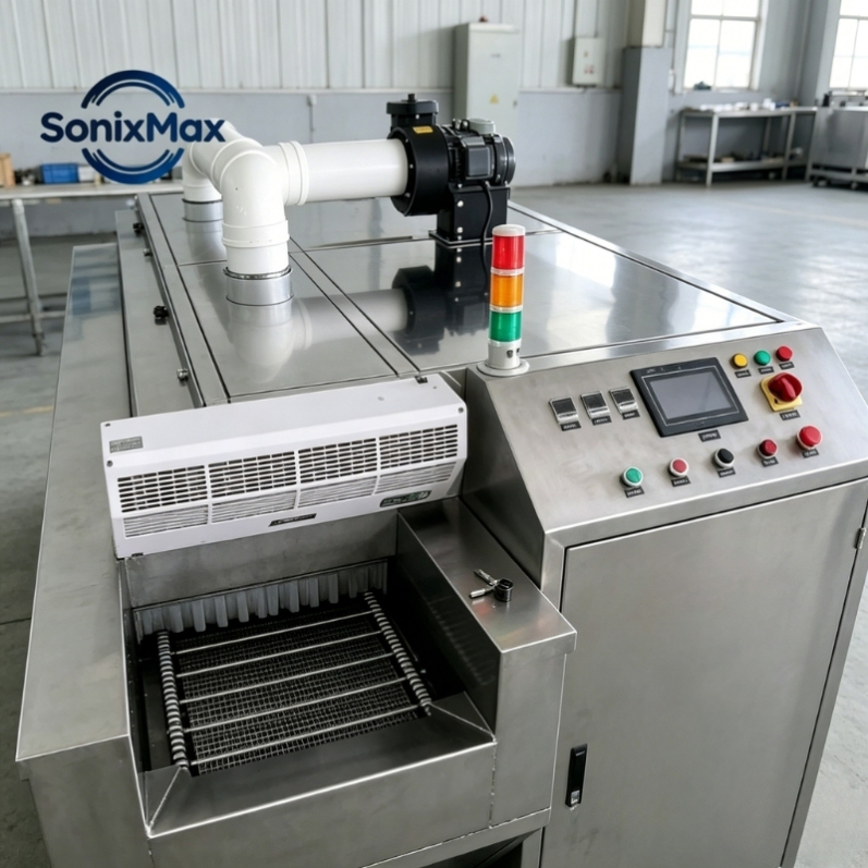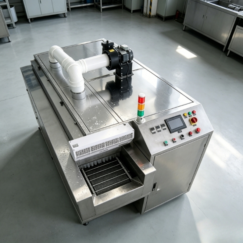 - Heavy-Duty Herringbone Conveyor: Equipped with a stainless steel herringbone baffle chain net. The speed is fully adjustable (300-1000mm/min) and features a torque limiter to protect the 400W horizontal gear reduction motor from overloads.