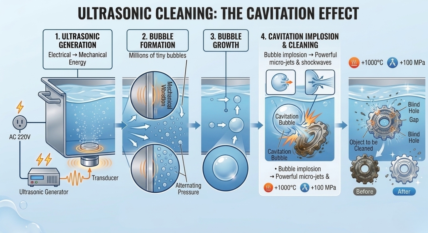 - Implosion: Bubbles collapse to release energy, scrubbing away dirt from blind holes instantly.